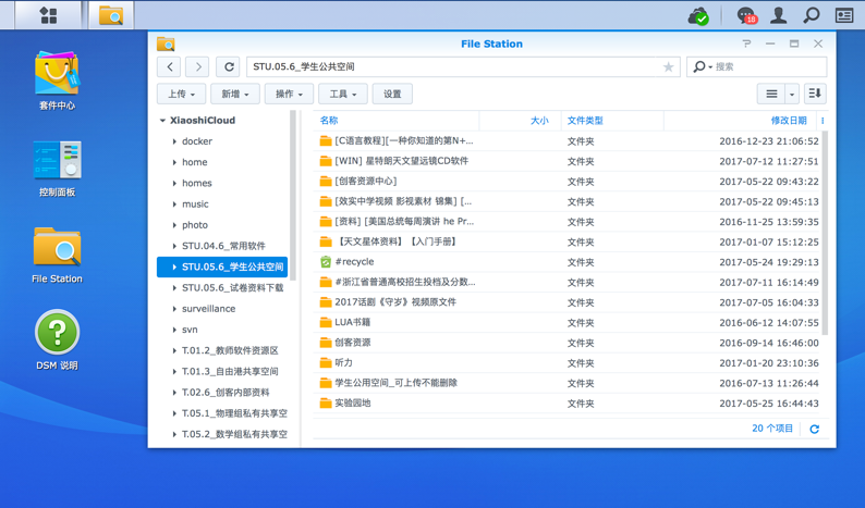說(shuō)到資料的整合,這里也不得不說(shuō)一下資料的存儲(chǔ)與管理。學(xué)校因?yàn)轭悇e繁復(fù),文件較多且較分散,存放及調(diào)取都非常麻煩。使用 File Station 之后可以非常便利的進(jìn)行分類并存放文件,全校都可以用來(lái)存儲(chǔ)下載文件。通過不同的權(quán)限分配,以及不同功能的文件夾,將不同課目,不同班級(jí)等進(jìn)行整理分類后, 所有文件一目了然。